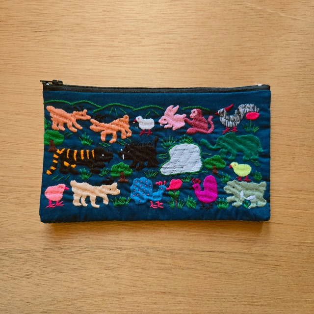 ラオスの山岳地域に住む少数民族モン族の手刺繍が施されたフラットタイプのポーチ。 いきいきとした動物たちが、細やかな刺繍で描かれた賑やかな一品です。 すべて手刺繍のため、すべて色合いや動物の表情まで一点一点異なります。 ぜひじっくり見比べてお気に入りを見つけてください。 カラフルで華やかな雰囲気のデザインは、お祝いやお礼のギフトにもおすすめです。 ペンケースとしても使える横長のサイズです。 充電コードなど旅行にものときのいろいろを入れたり、お札も折らずに入るので簡易的なお財布としても使いやすいサイズです。 しっかり裏地付きで、裏面は白無地です。 末永く大切に使ってくださる方に見つけてもらえたら嬉しいです。 [サイズ] 約 11cm × 21cm マチなし ※ハンドメイドのため個体差あり 《ご購入前に必ずお読みください》 1、 海外製の手仕事の作品を中心に取り扱っております。 ひとつひとつ検品していますが、歪みや色ムラ、裁縫のズレなどがある場合がございます。 ぜひ、手作りならではの愛嬌としてお楽しみください。 2、 お使いの端末や閲覧環境により、写真と実物の色味や質感が多少異なって見える場合がございます。 また、色やモチーフの名前は参考程度にお考えください。 以上、ご理解いただいた上でのご購入をお願い致します。 気になる点がございましたら、ご購入前にお気軽にお問い合わせください。