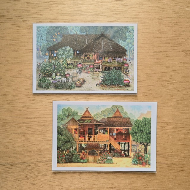 チェンマイの画家Samart Wichantoさんの絵をプリントしたポストカードです。 田舎のおばちゃん家のような古き良きタイの生活の様子が描かれています。 いきいきと描かれた動物たちも可愛らしいです。 元々はハンドペイントの大きな一枚絵のため、細部まで描き込まれていて、じっくり見れば見るほど楽しめます。 温かみのあるタッチの絵のポストカードは、送る人ももらう人も優しい気持ちにさせてくれます。 大切な方へのメッセージカードとしてはもちろん、そのままお部屋に飾るのもおすすめです。 末永く大切に使ってくださる方に見つけてもらえたら嬉しいです。 [サイズ] 約 15cm × 10cm 《ご購入前に必ずお読みください》 1、 海外製の手仕事の作品を中心に取り扱っております。 ひとつひとつ検品していますが、歪みや色ムラ、裁縫のズレなどがある場合がございます。 ぜひ、手作りならではの愛嬌としてお楽しみください。 2、 お使いの端末や閲覧環境により、写真と実物の色味や質感が多少異なって見える場合がございます。 また、色やモチーフの名前は参考程度にお考えください。 以上、ご理解いただいた上でのご購入をお願い致します。 気になる点がございましたら、ご購入前にお気軽にお問い合わせください。