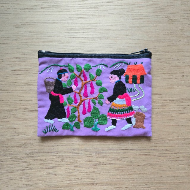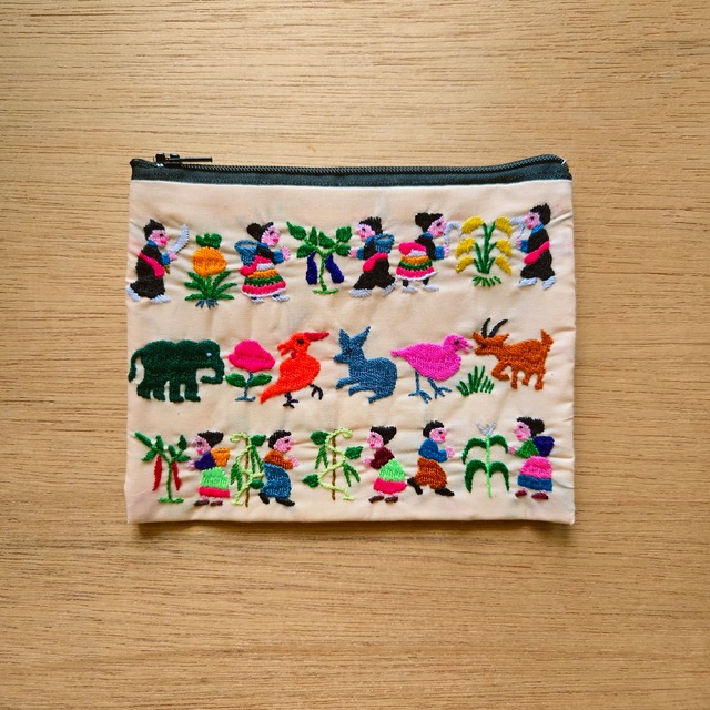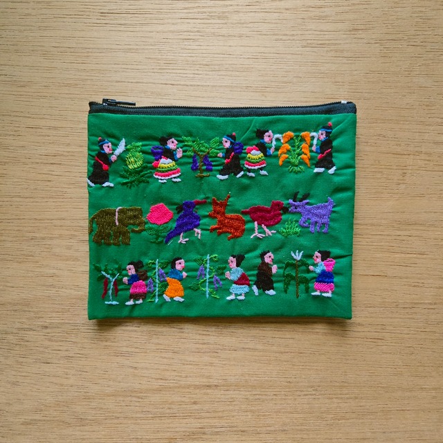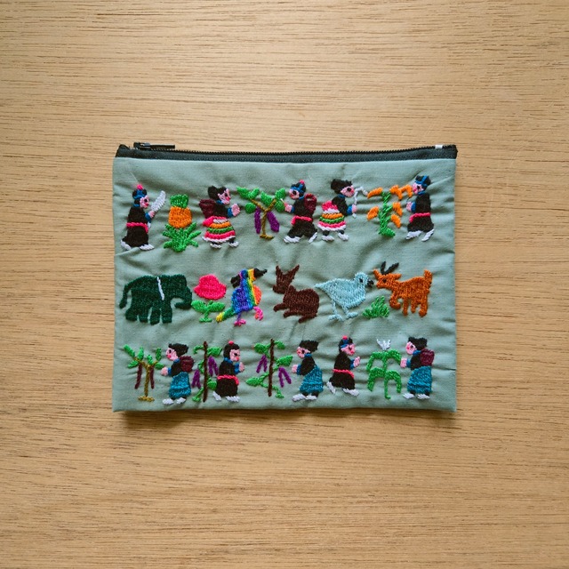 ラオスの山岳地域に住む少数民族モン族の手刺繍が施されたフラットタイプのポーチ。 モン族の村での生活の様子や動物たちが、細やかな刺繍で描かれた賑やかな一品です。 裏面にもワンポイント刺繍付き。 すべて手刺繍のため、すべて色合いや人々の表情まで一点一点異なります。 ぜひじっくり見比べてお気に入りを見つけてください。 カラフルで華やかな雰囲気のデザインは、お祝いやお礼のギフトにもおすすめです。 コインケースや持ち歩き用のメイクポーチとして、日常生活で使いやすいサイズ。 しっかり裏地付きです。 末永く大切に使ってくださる方に見つけてもらえたら嬉しいです。 [サイズ] 約 15cm × 12cm マチなし ※ハンドメイドのため個体差あり 《ご購入前に必ずお読みください》 1、 海外製の手仕事の作品を中心に取り扱っております。 ひとつひとつ検品していますが、歪みや色ムラ、裁縫のズレなどがある場合がございます。 ぜひ、手作りならではの愛嬌としてお楽しみください。 2、 お使いの端末や閲覧環境により、写真と実物の色味や質感が多少異なって見える場合がございます。 また、色やモチーフの名前は参考程度にお考えください。 以上、ご理解いただいた上でのご購入をお願い致します。 気になる点がございましたら、ご購入前にお気軽にお問い合わせください。