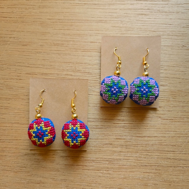 ラオスに暮らすモン族の手刺繍パーツを使ったピアス。 小さな布の中に、細かな手仕事がぎゅっと詰まっています。 刺繍は両面仕上げ。 立体的な作りで、どの角度から見ても楽しめます。 とても軽い素材なので、耳への負担も少なくお使いいただけます。 持ち歩きや収納に便利なシアーミニ巾着に入れてお届けします。 ※ピアスパーツの素材が不明のため、金属アレルギーの方はご注意ください。 末永く大切に使ってくださる方に見つけてもらえたら嬉しいです。 [サイズ] 約 2cm × 2cm (ピアスパーツ部分を除く) 《ご購入前に必ずお読みください》 1、 海外製の手仕事の作品を中心に取り扱っております。 ひとつひとつ検品していますが、歪みや色ムラ、裁縫のズレなどがある場合がございます。 ぜひ、手作りならではの愛嬌としてお楽しみください。 2、 お使いの端末や閲覧環境により、写真と実物の色味や質感が多少異なって見える場合がございます。 また、色やモチーフの名前は参考程度にお考えください。 以上、ご理解いただいた上でのご購入をお願い致します。 気になる点がございましたら、ご購入前にお気軽にお問い合わせください。
