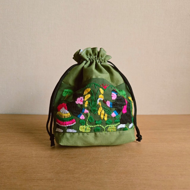ラオスの山岳地域に住む少数民族モン族の手刺繍が施されたマチ付きの巾着。 モン族の村での生活の様子が、両面に細やかな刺繍で描かれた賑やかな一品です。 すべて手刺繍のため、すべて色合いや人々の表情まで一点一点異なります。 ぜひじっくり見比べてお気に入りを見つけてください。 カラフルで華やかな雰囲気のデザインは、お祝いやお礼のギフトにもおすすめです。 持ち歩き用のメイクポーチやおやつを入れたり、日常生活で使いやすいサイズ。 しっかり裏地付きです。 末永く大切に使ってくださる方に見つけてもらえたら嬉しいです。 [サイズ] 約 15cm × 15cm マチ 約4cm ※ハンドメイドのため個体差あり 《ご購入前に必ずお読みください》 1、 海外製の手仕事の作品を中心に取り扱っております。 ひとつひとつ検品していますが、歪みや色ムラ、裁縫のズレなどがある場合がございます。 ぜひ、手作りならではの愛嬌としてお楽しみください。 2、 お使いの端末や閲覧環境により、写真と実物の色味や質感が多少異なって見える場合がございます。 また、色やモチーフの名前は参考程度にお考えください。 以上、ご理解いただいた上でのご購入をお願い致します。 気になる点がございましたら、ご購入前にお気軽にお問い合わせください。