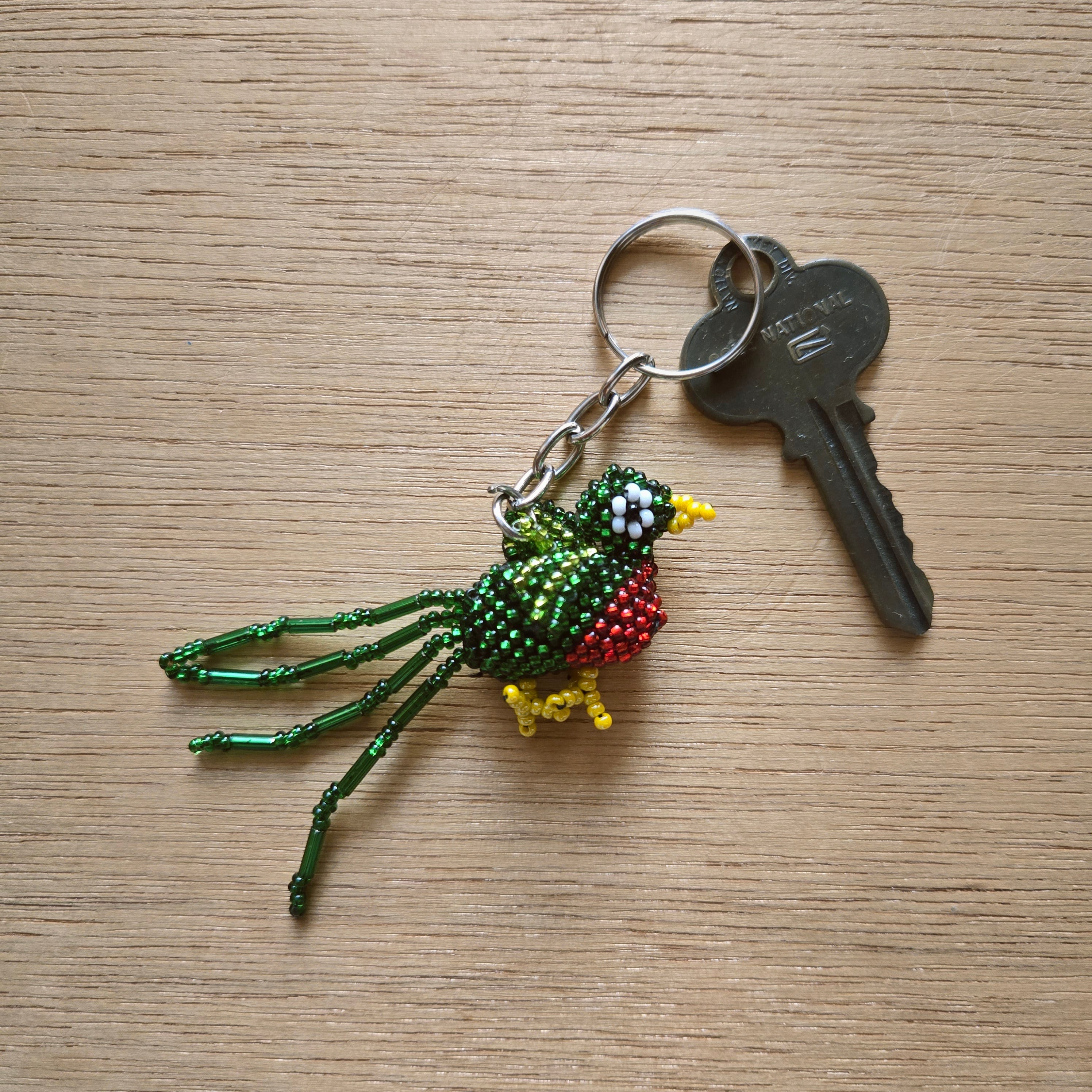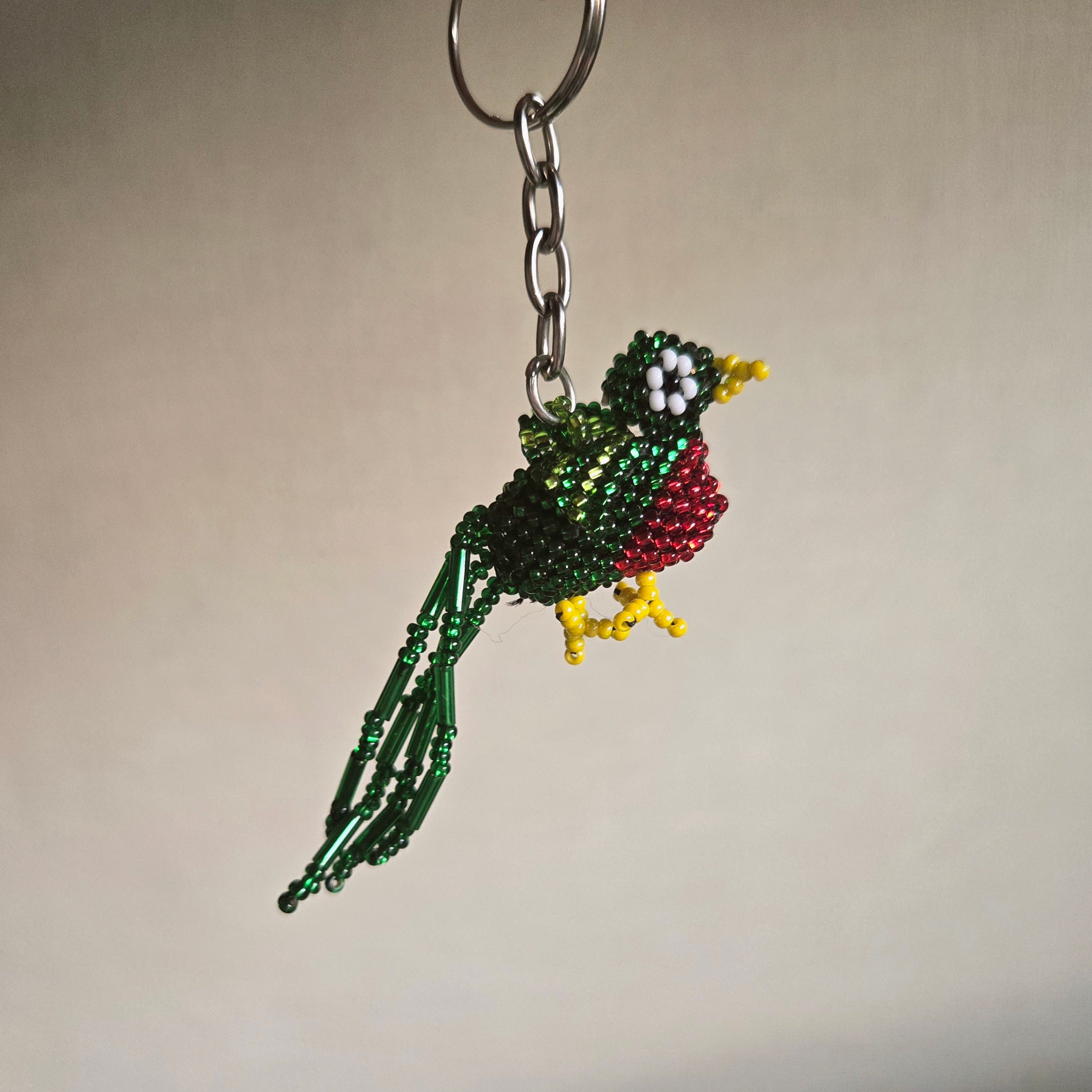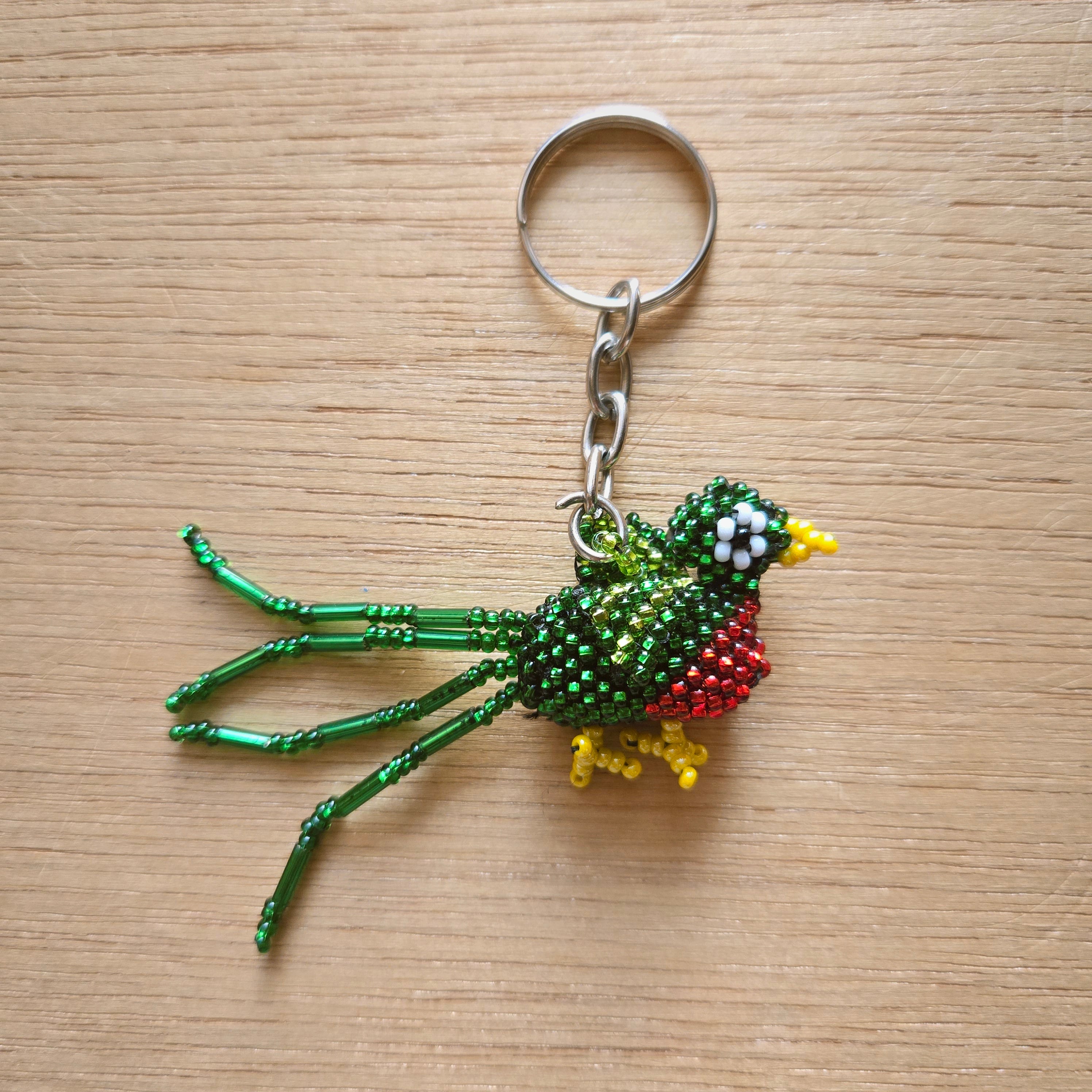 どこか懐かしいビーズ細工で作られたミニサイズのケツァールのキーホルダーです。
