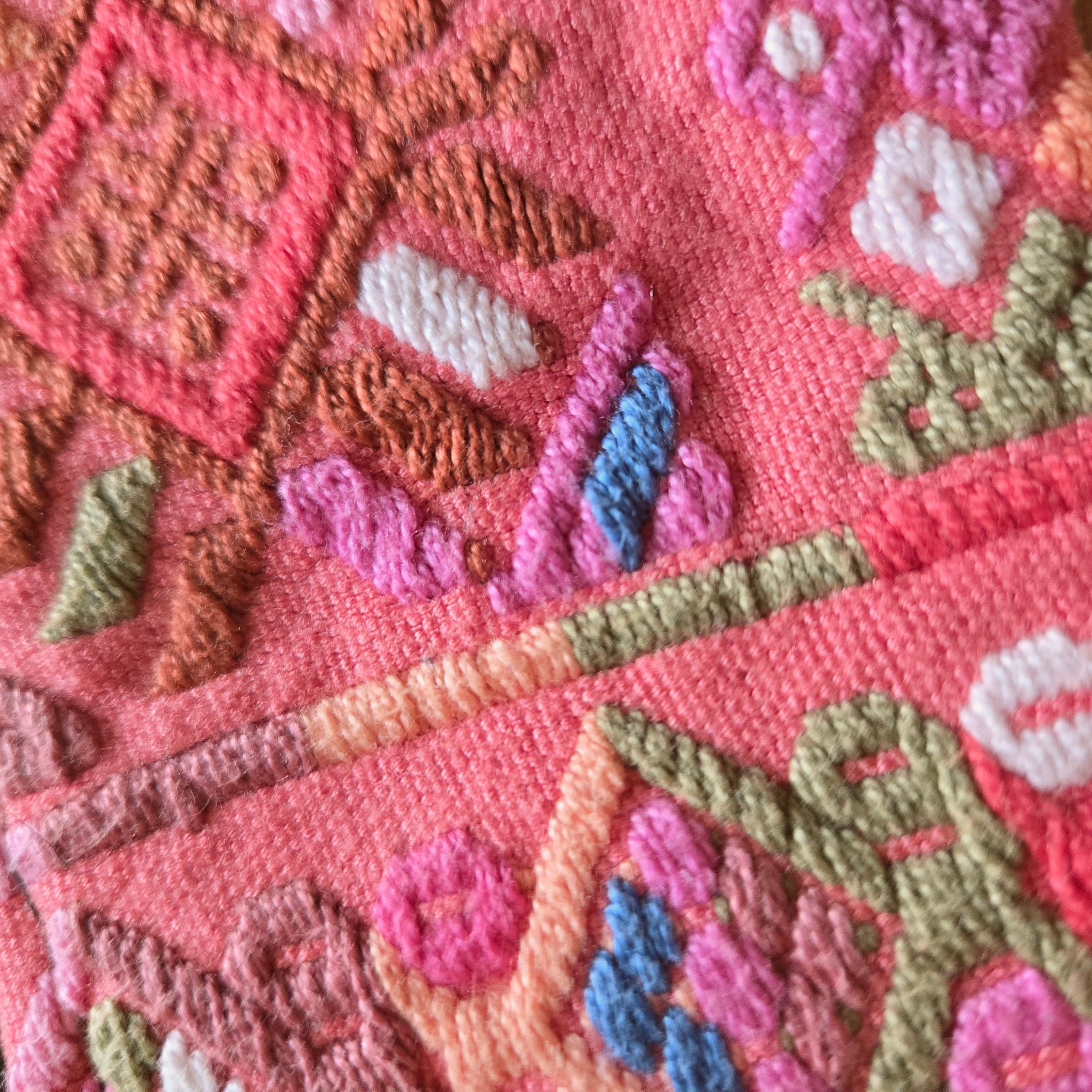 古代マヤ文明の時代から続く織りの技術で作られた細かな模様の美しさ、そして中米らしいカラフルな色合いが目を引きます。