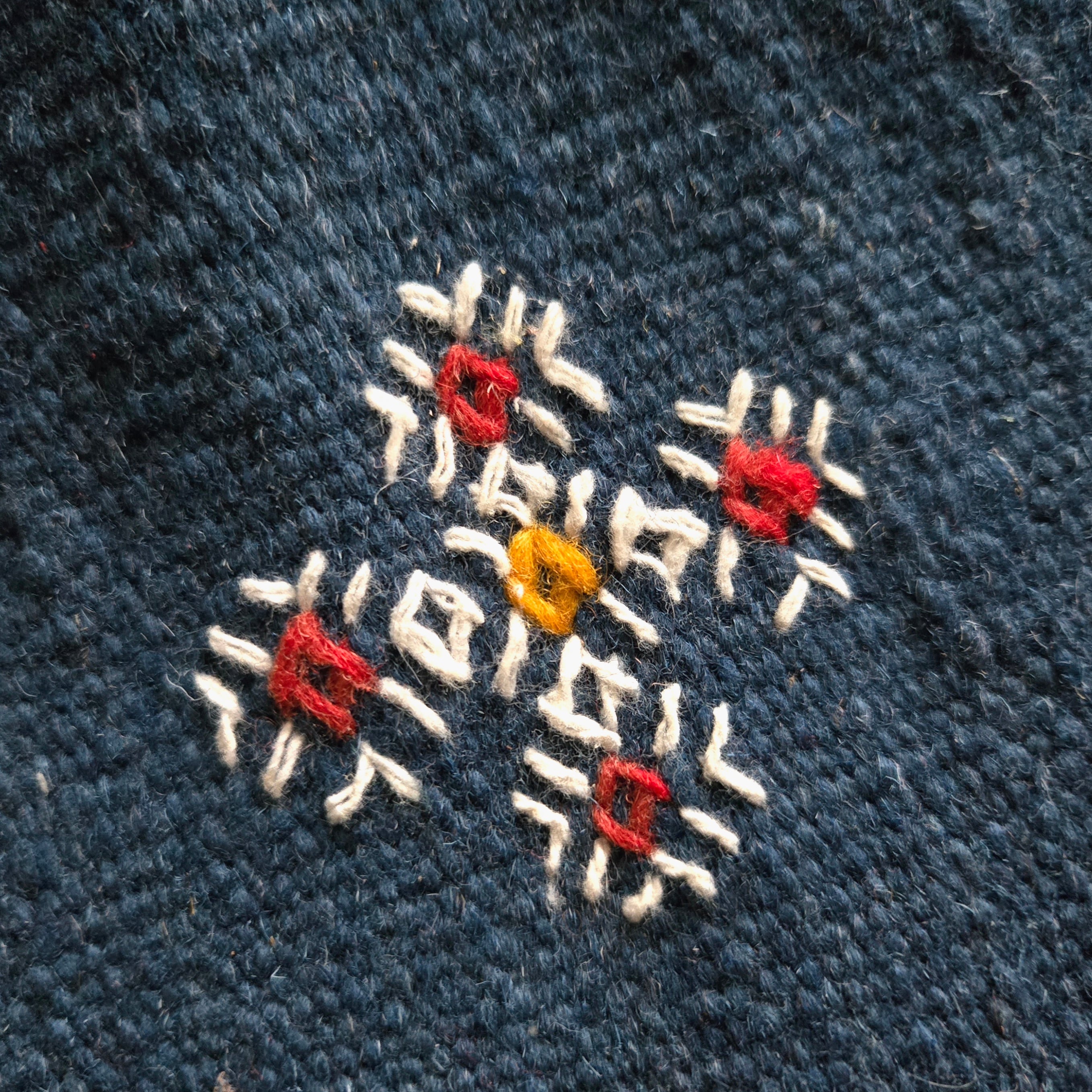 濃い藍色をベースに、ところどころに小さな文様が散りばめられた、素朴で落ち着いた一枚です。