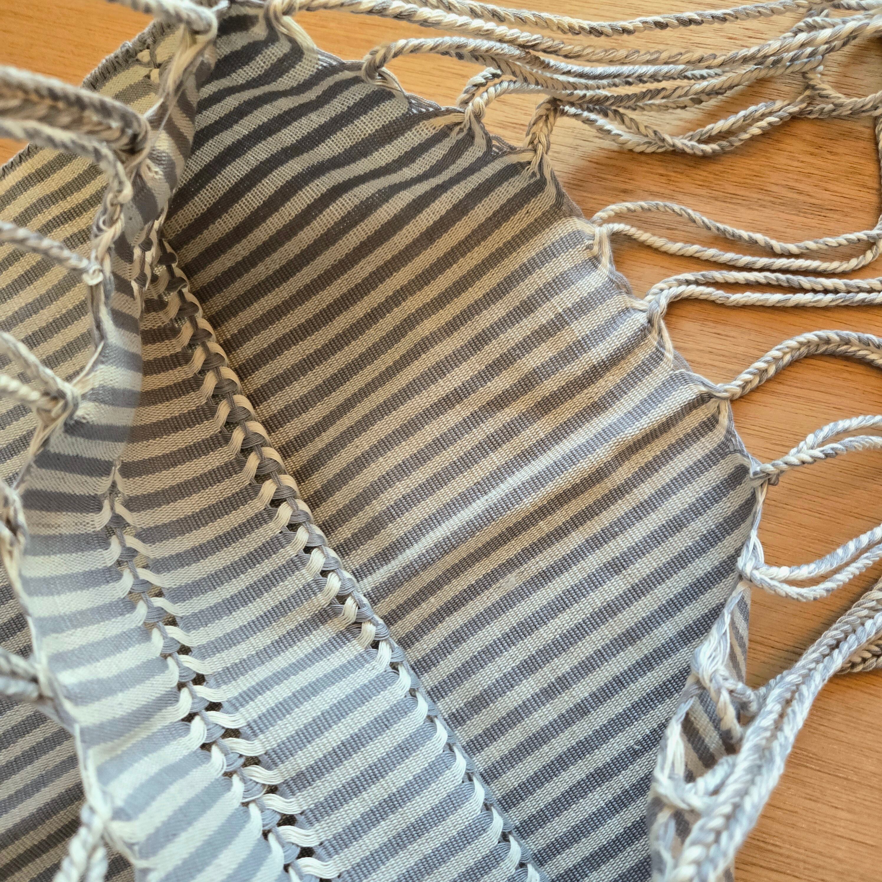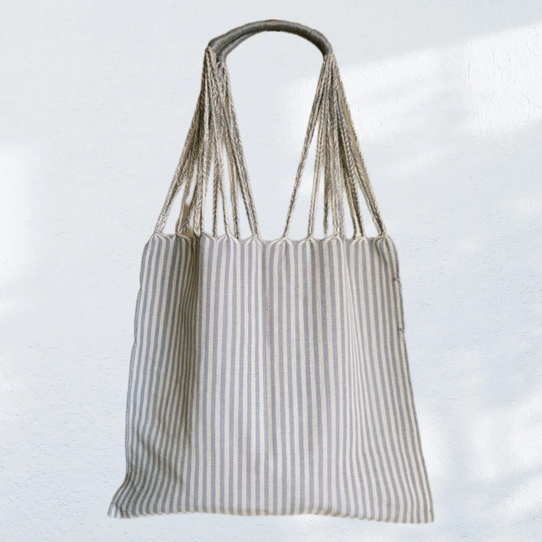 持ち手から反対側の持ち手までひと続きで織られているため、持ち手部分や底部分に縫い目がなく丈夫なつくりになっています。