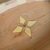 異なる色味の木を組み合わせた縁取りと、中央にあしらわれた幾何学模様が、印象的な一枚です。