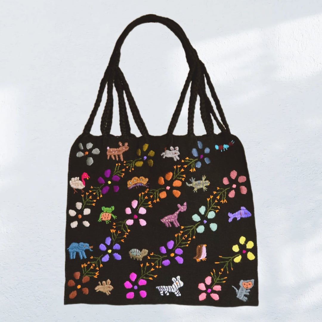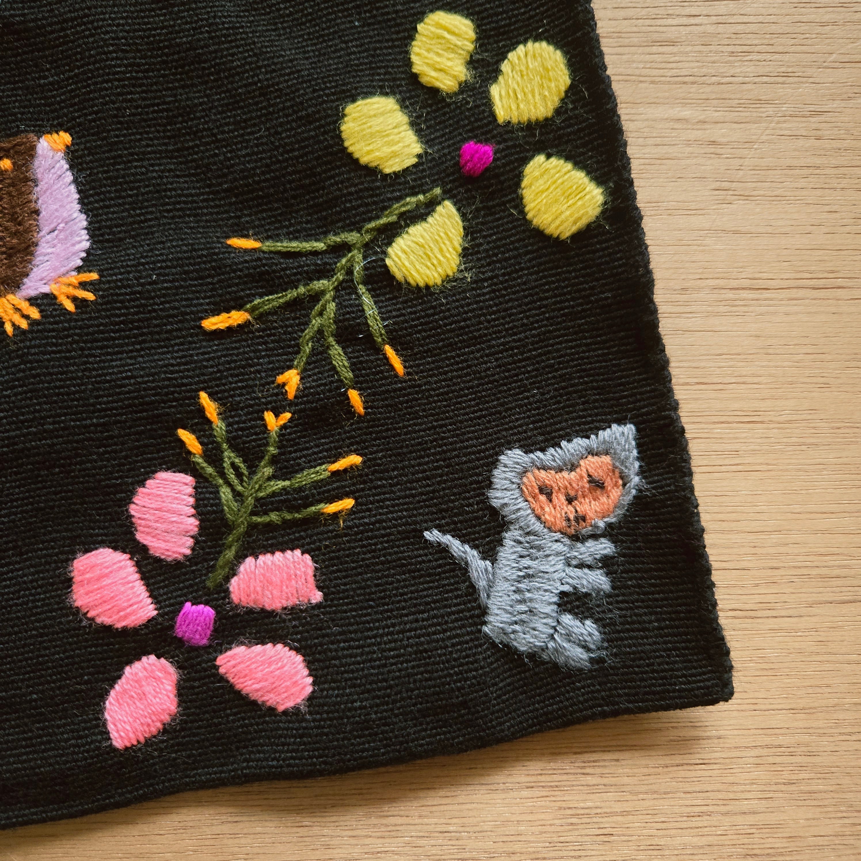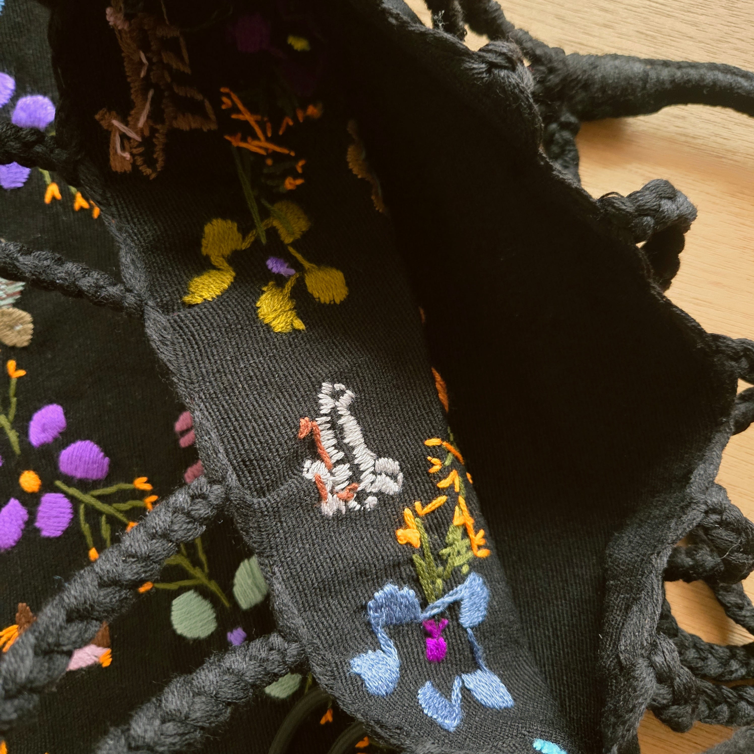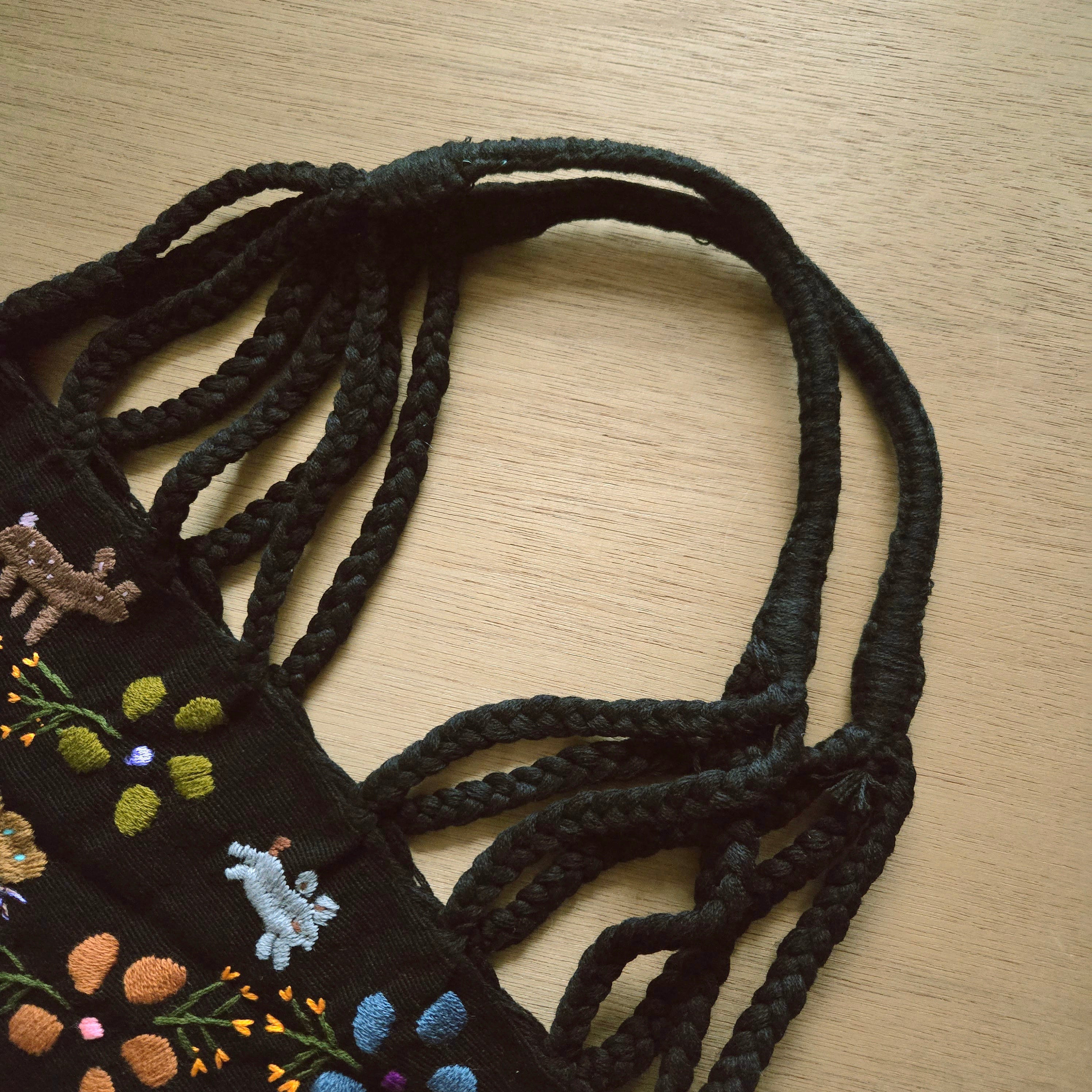腰機という原始的な手法で織られた手織りの生地に小さな動物や植物の手刺繡がたっぷり施されています。
