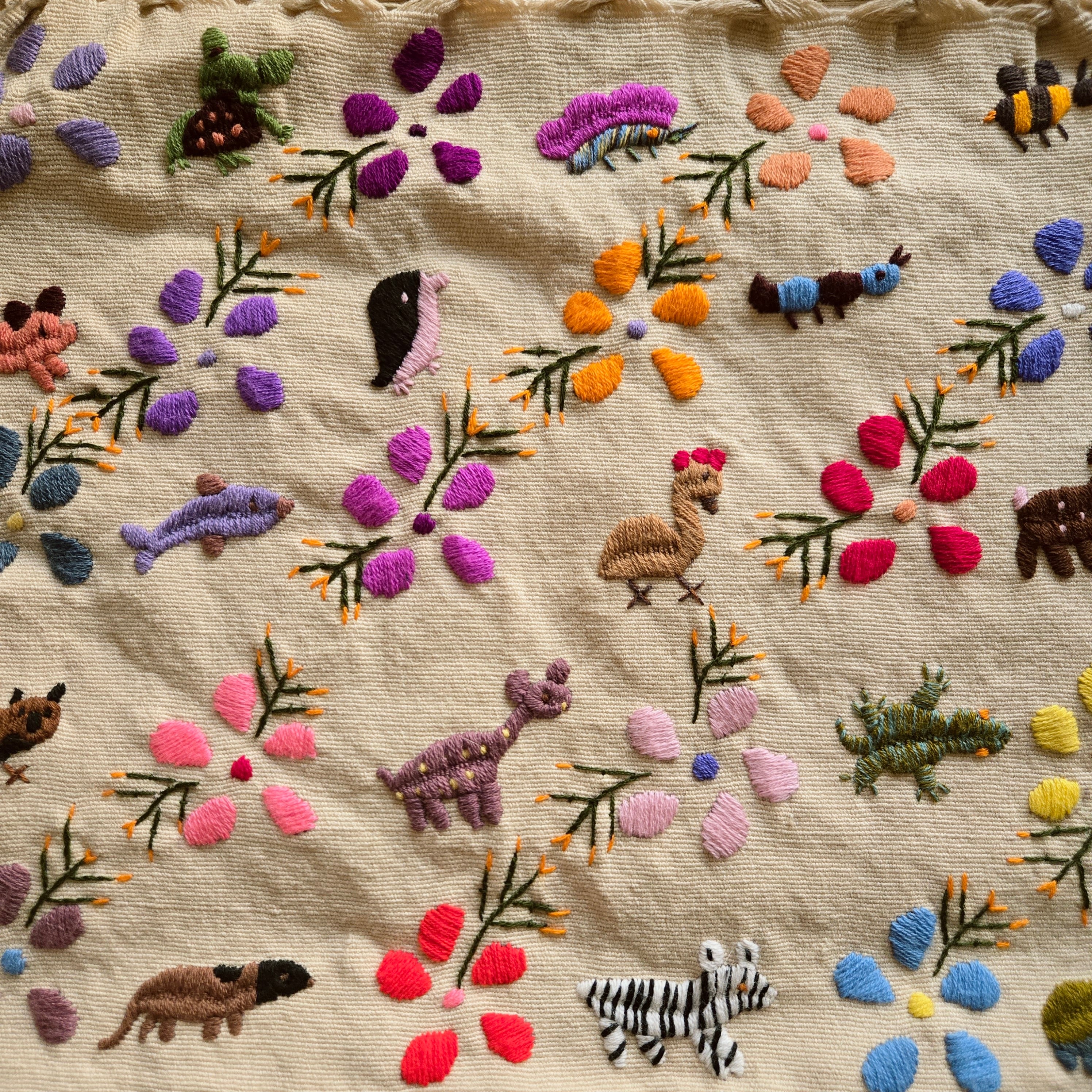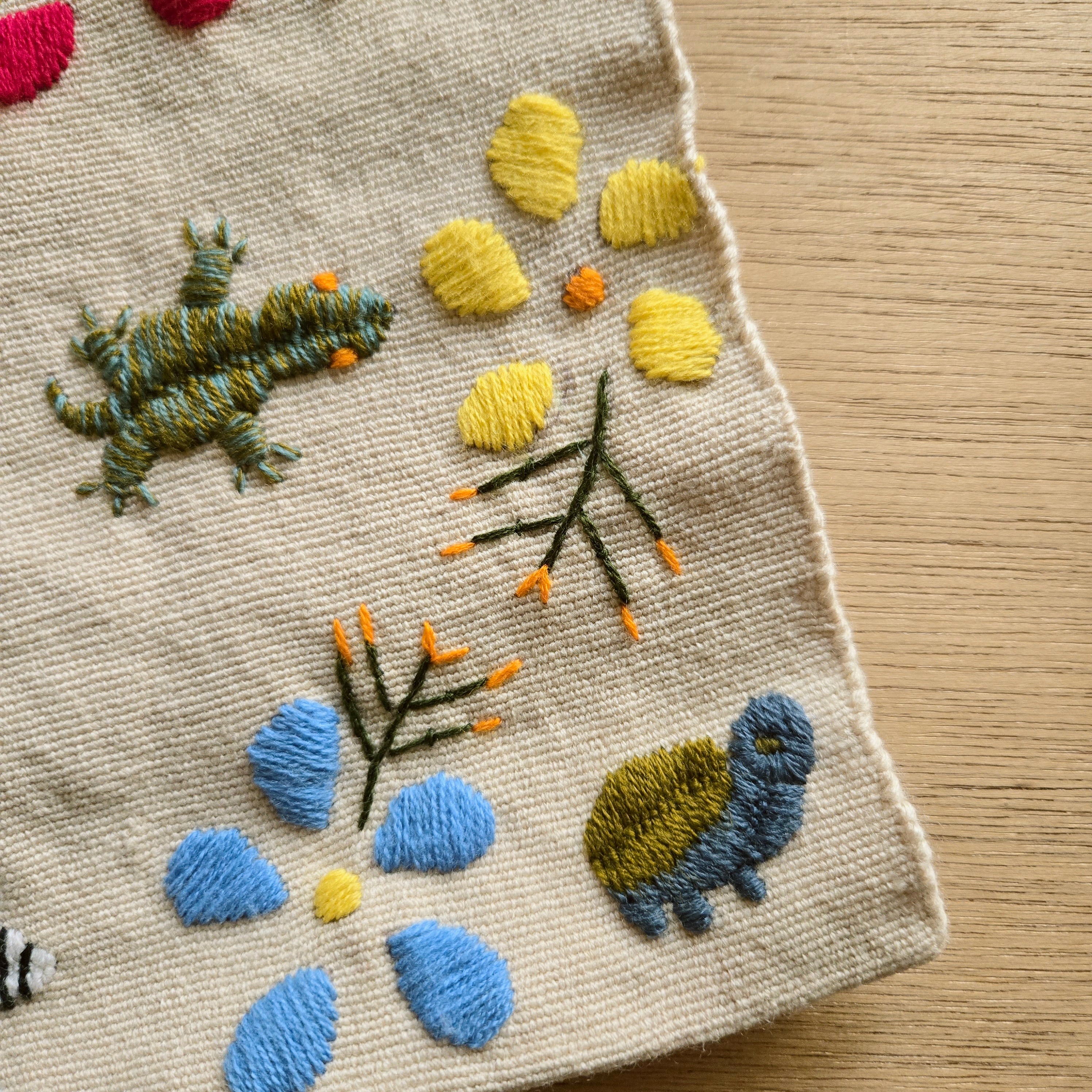腰機という原始的な手法で織られた手織りの生地に小さな動物や植物の手刺繡がたっぷり施されています。