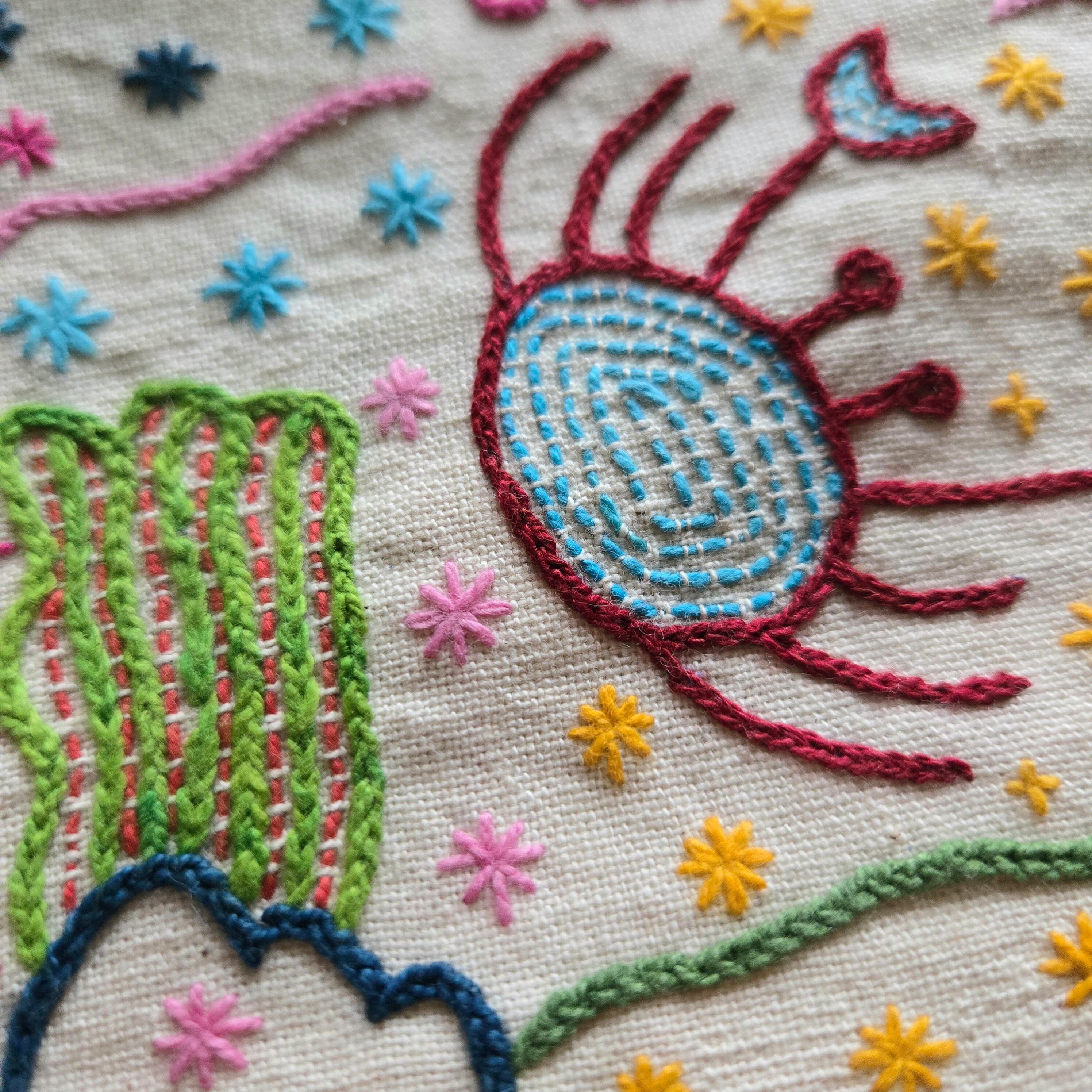 チェーンステッチを使った独特のタッチが可愛らしいハンドメイド感たっぷりの一品です。