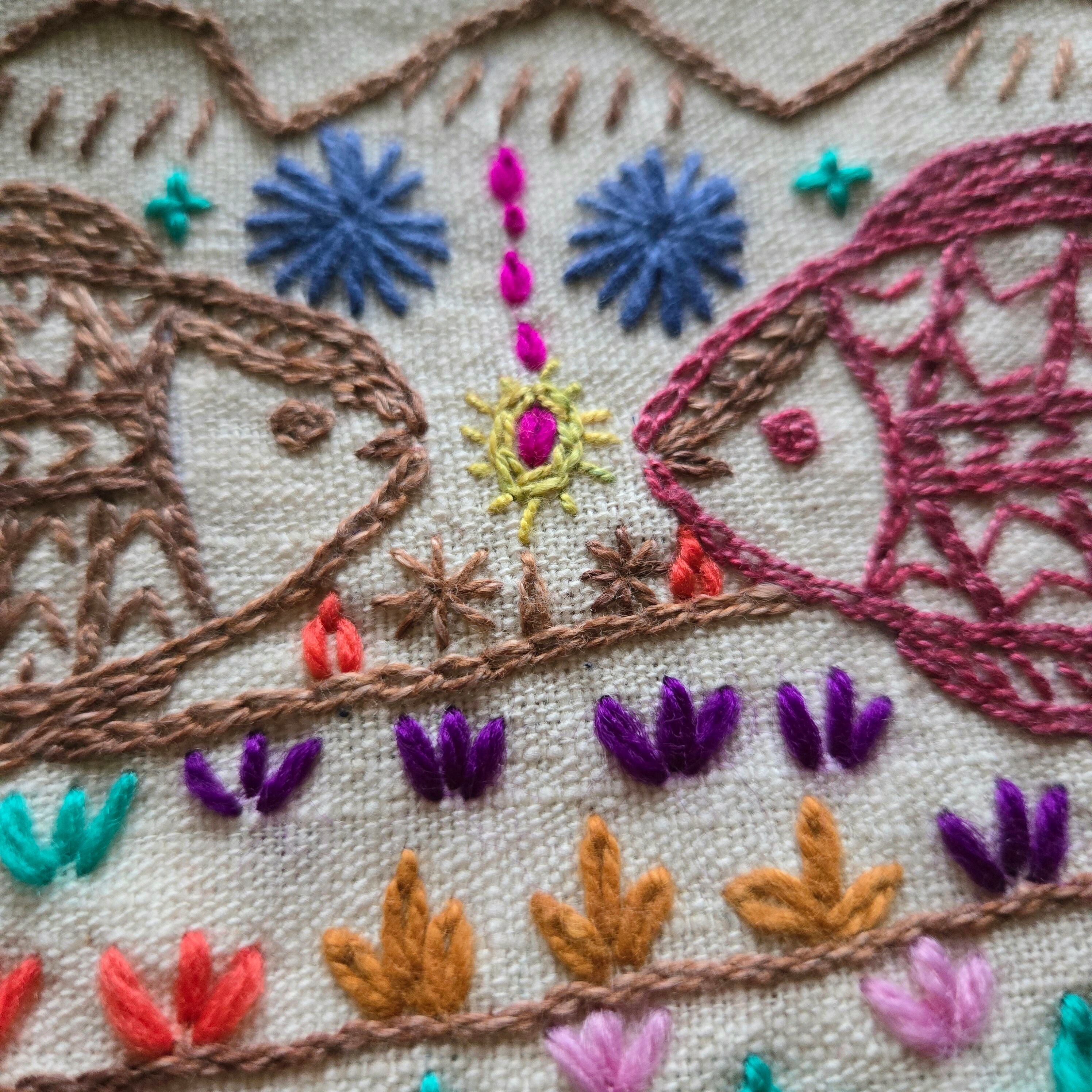 チェーンステッチを使った独特のタッチが可愛らしいハンドメイド感たっぷりの一品です。