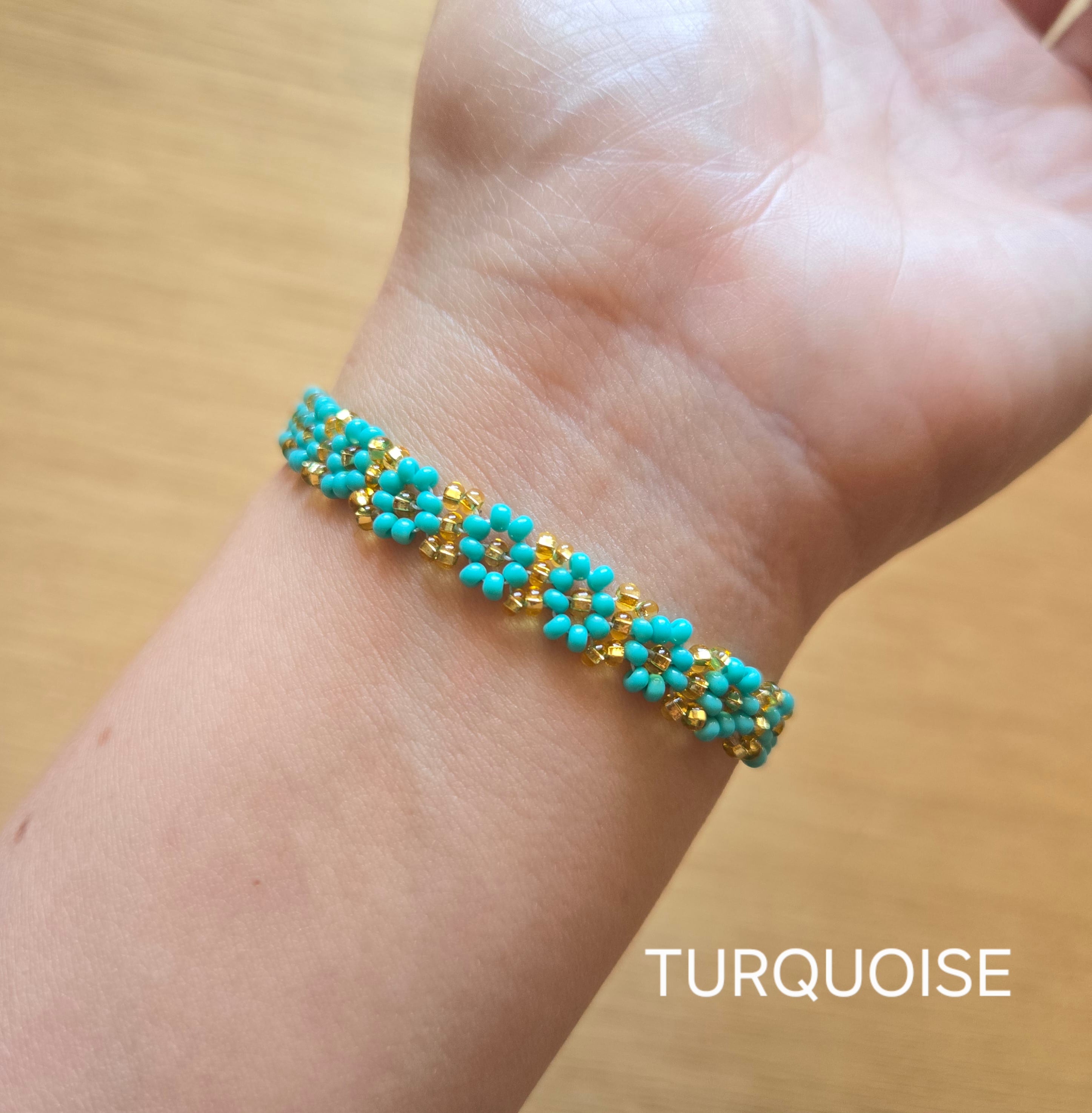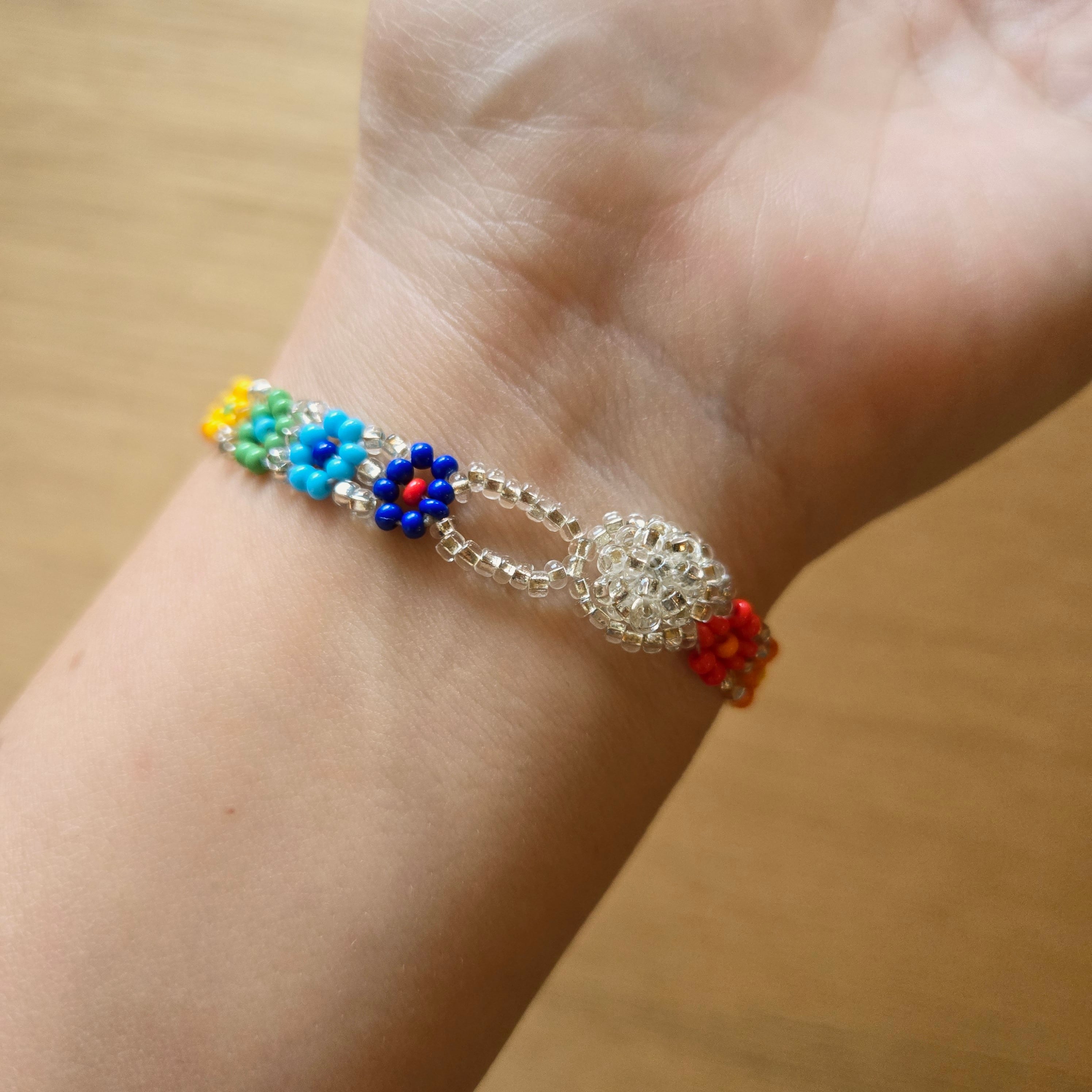 鮮やかなビーズで作られたお花のモチーフが手元を華やかに彩ります。