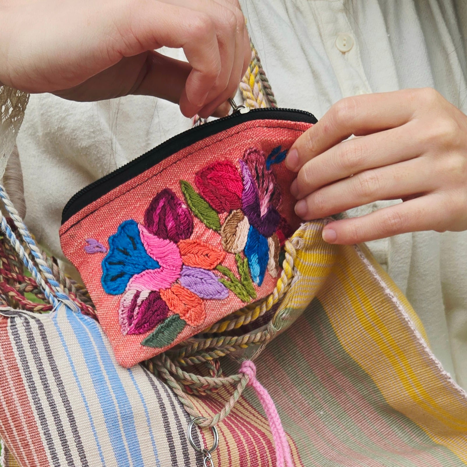 ポーチには全て手織り手刺繍で作られた芸術的なヴィンテージウイピルが贅沢に全面に使われています。