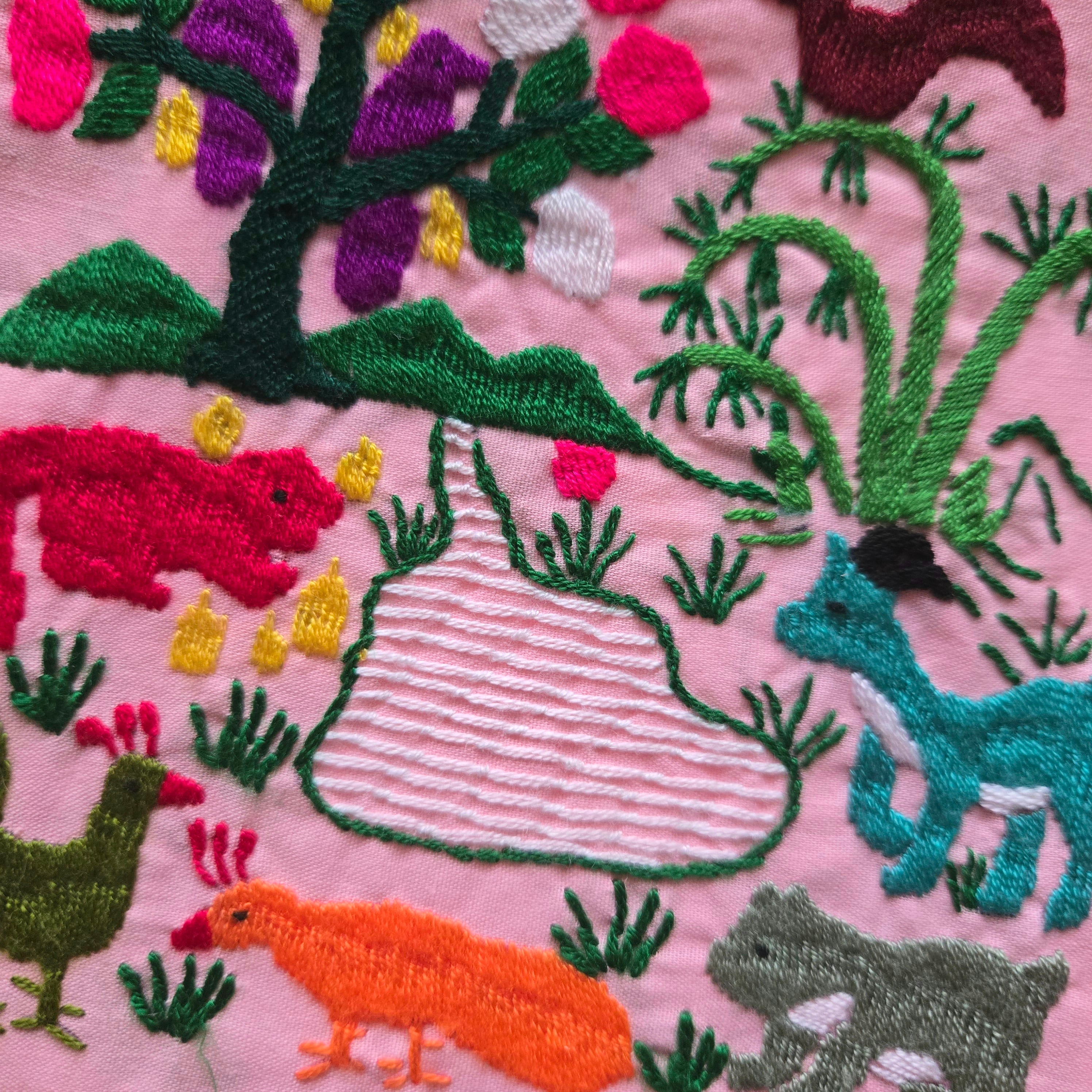 いきいきとした動物たちが、細やかな刺繍で描かれた賑やかな一品です。