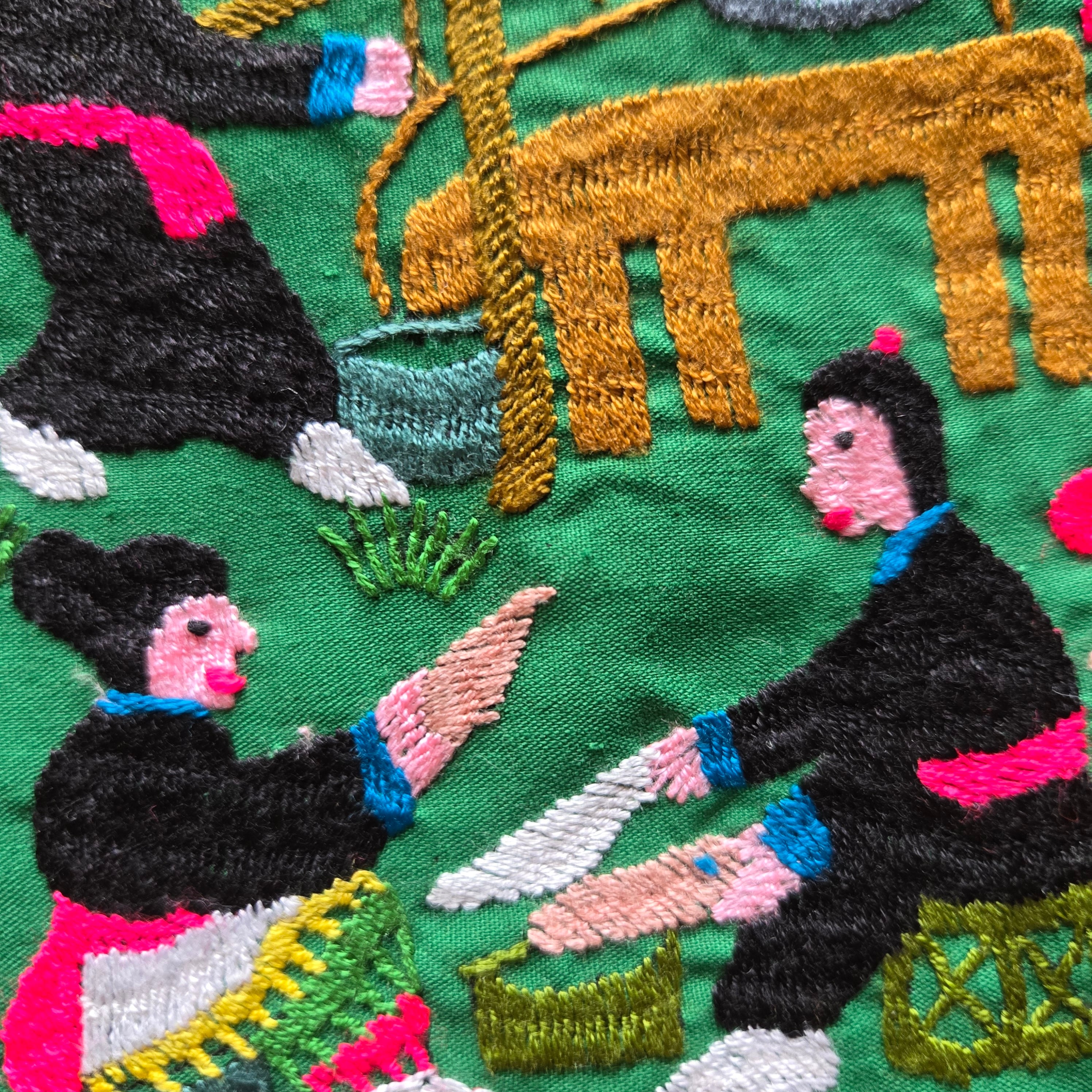 モン族の村での生活の様子が、細やかな刺繍で描かれた賑やかな一品です。
