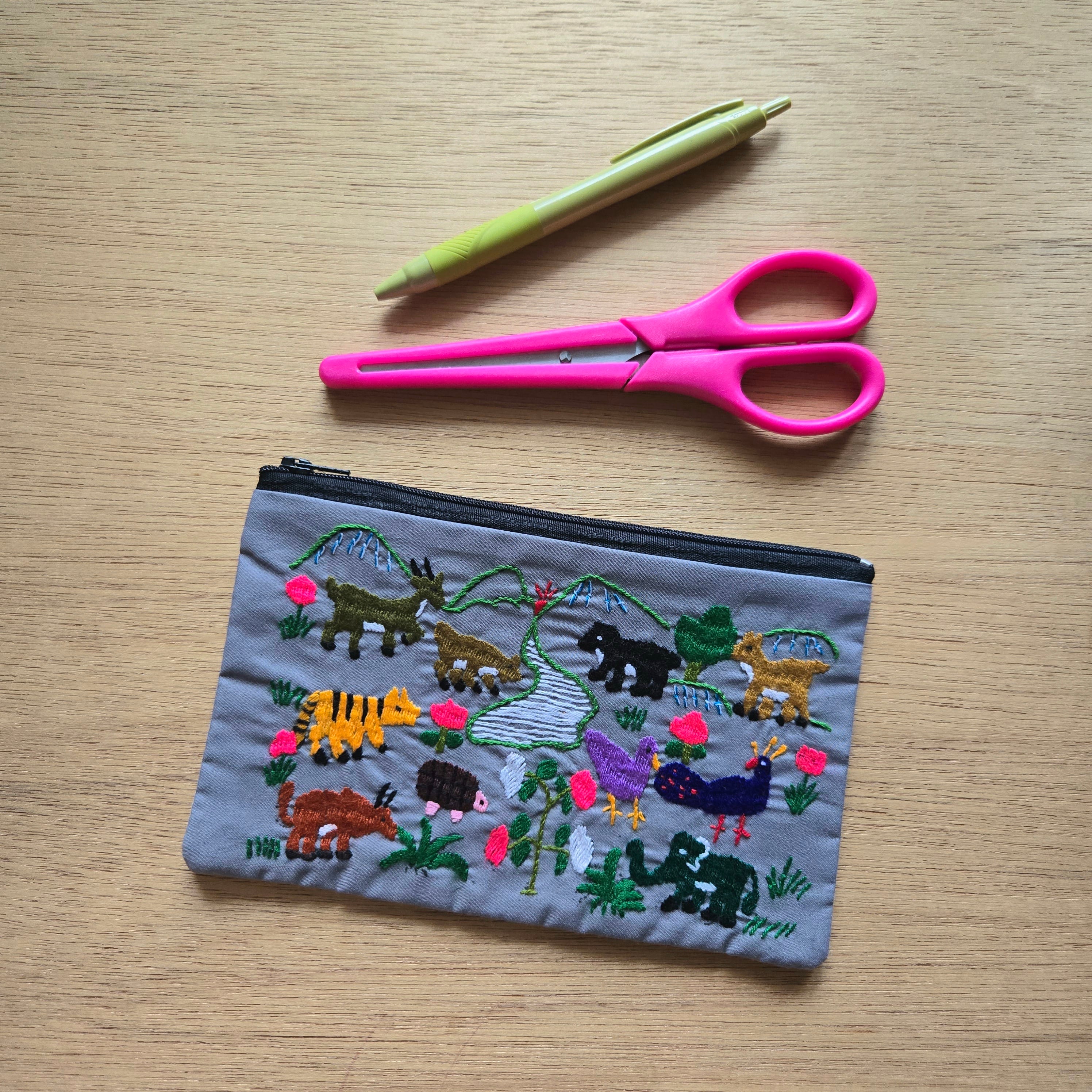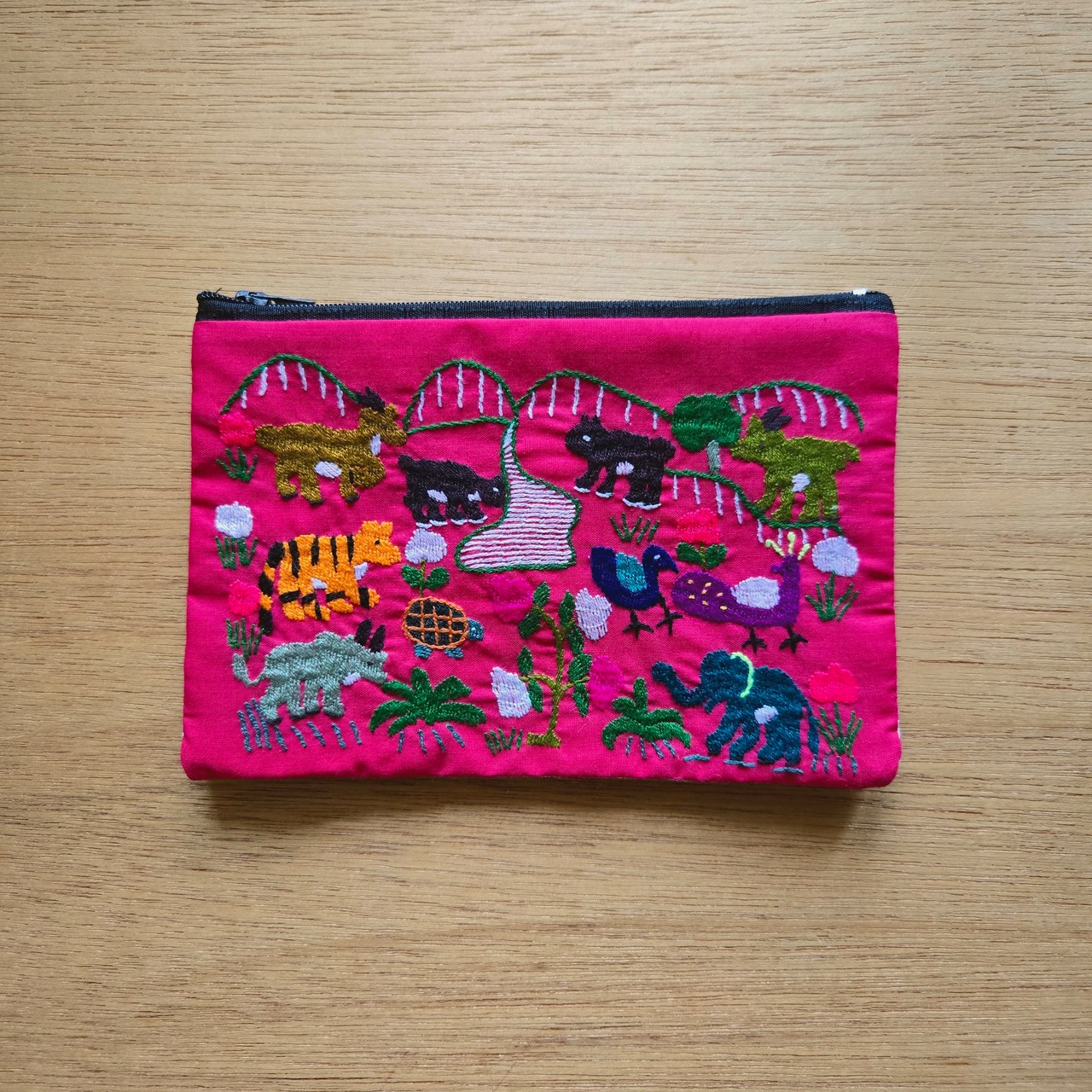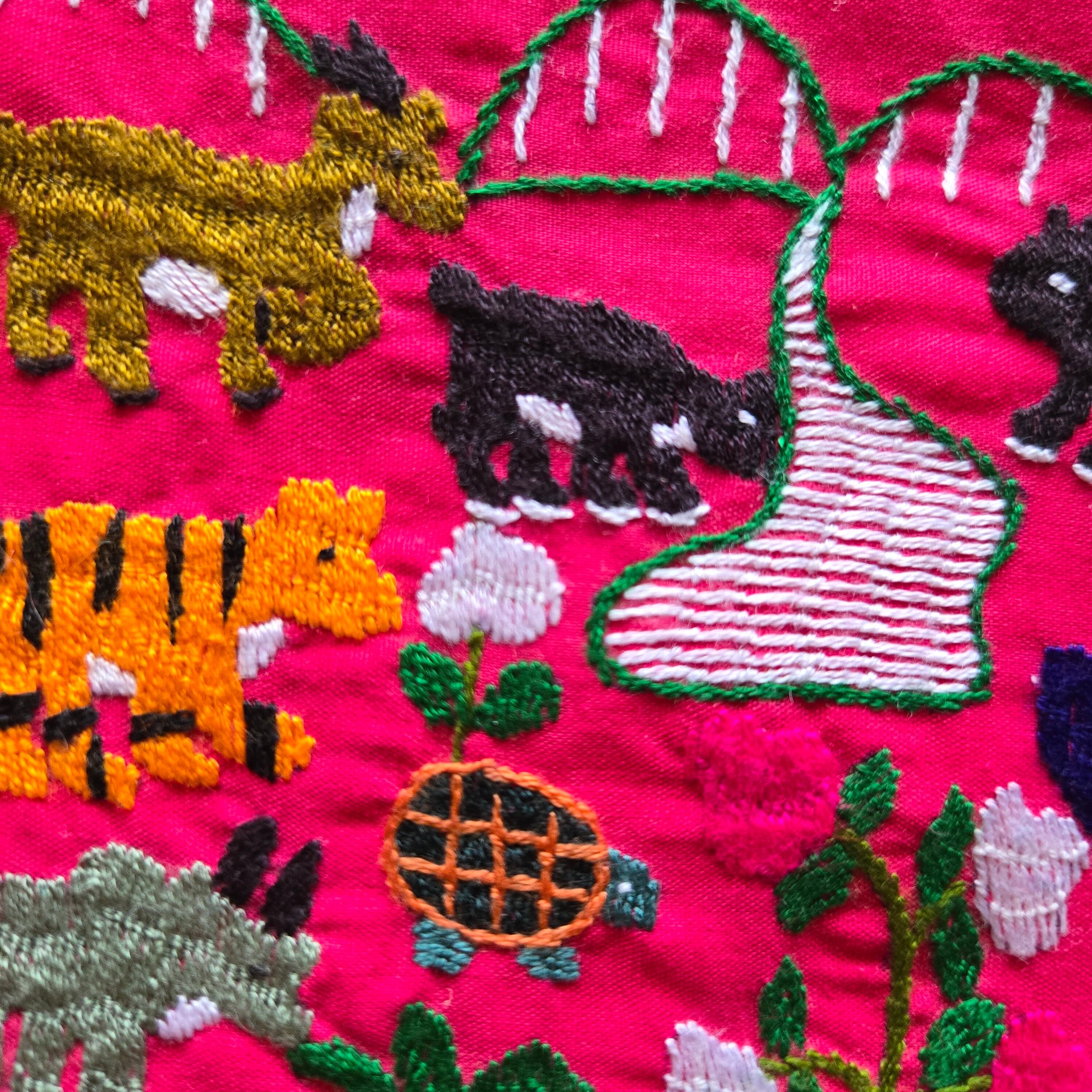 いきいきとした動物たちが、細やかな刺繍で描かれた賑やかな一品です。