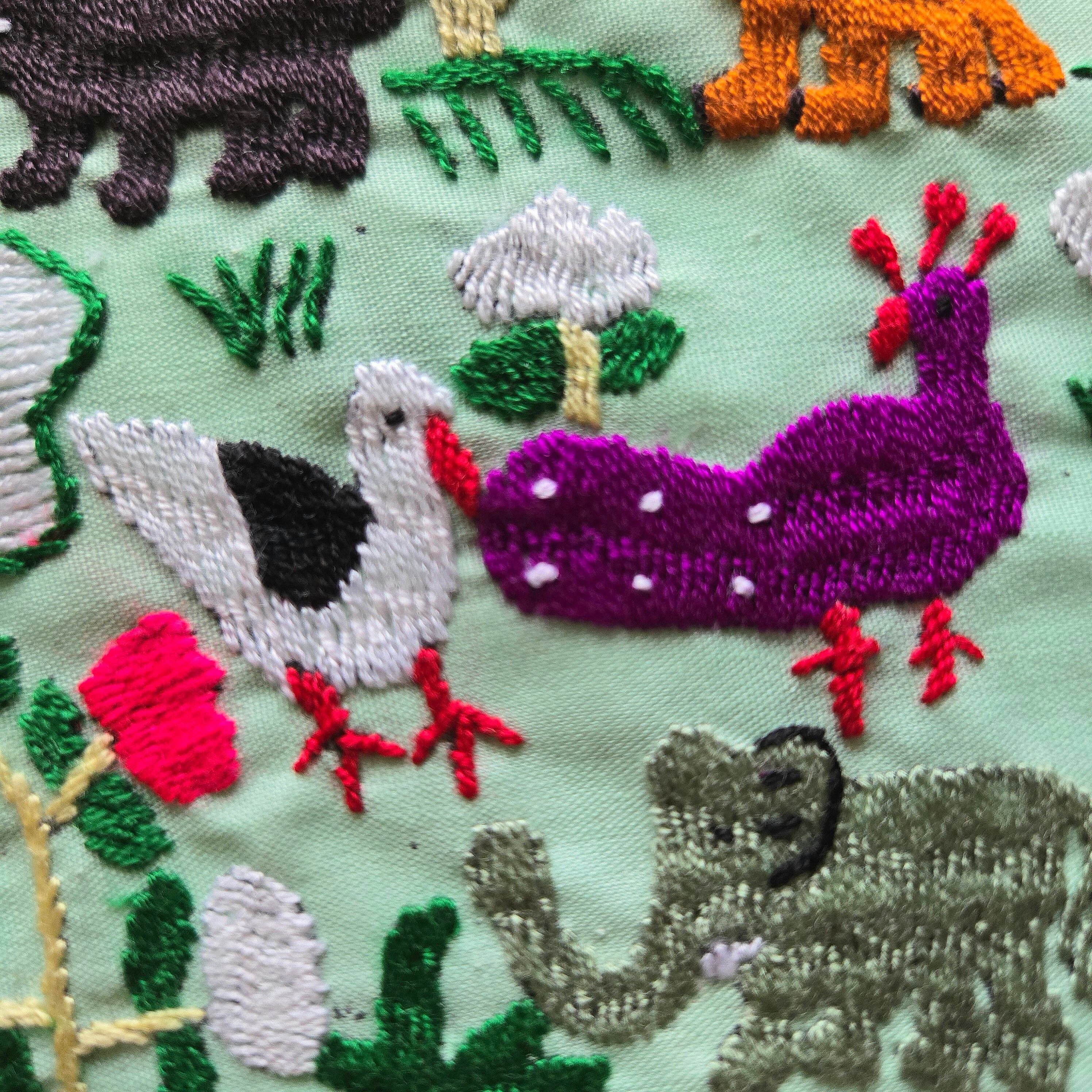 いきいきとした動物たちが、細やかな刺繍で描かれた賑やかな一品です。