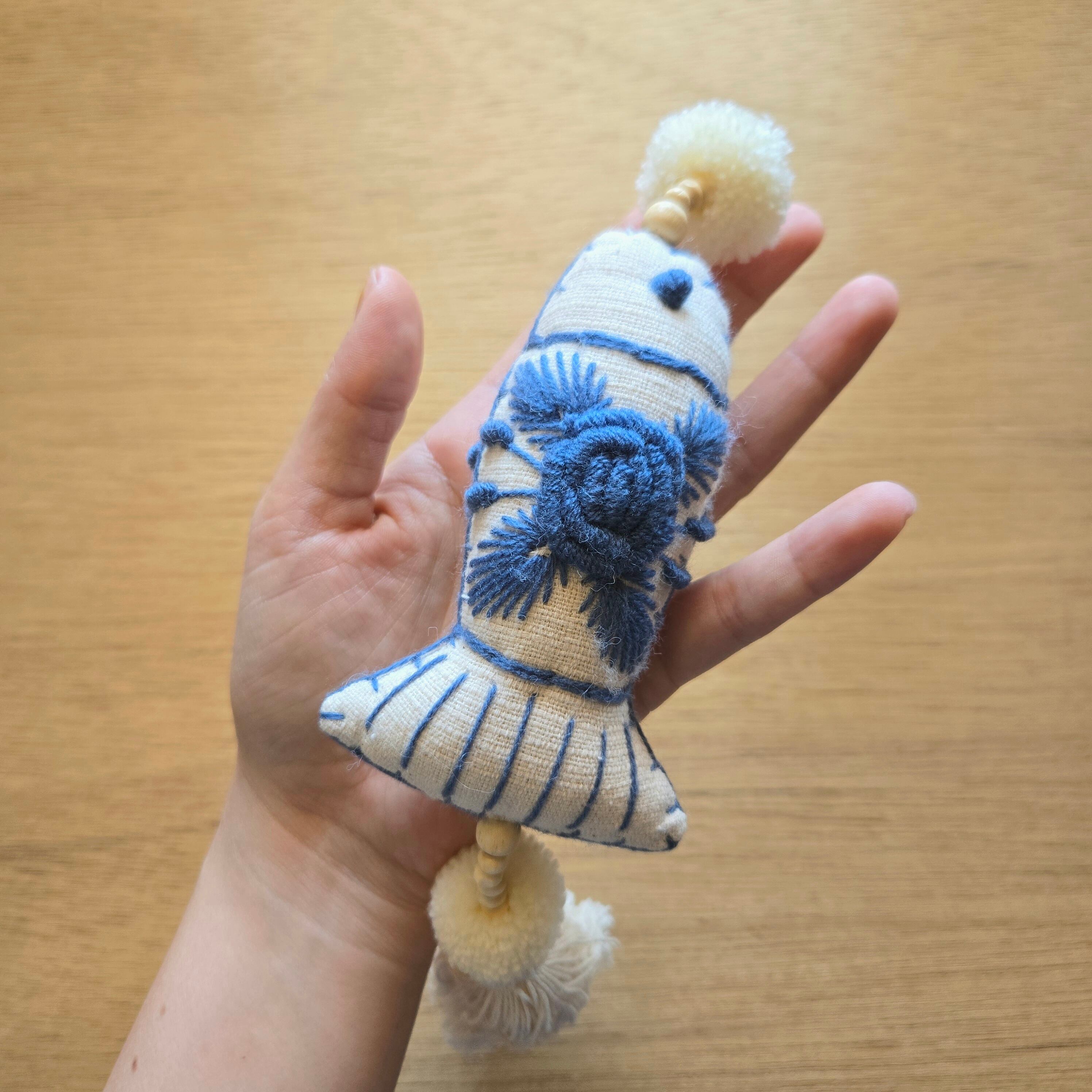可愛らしいお花の手刺繍が入った大きめのおさかなチャームです。