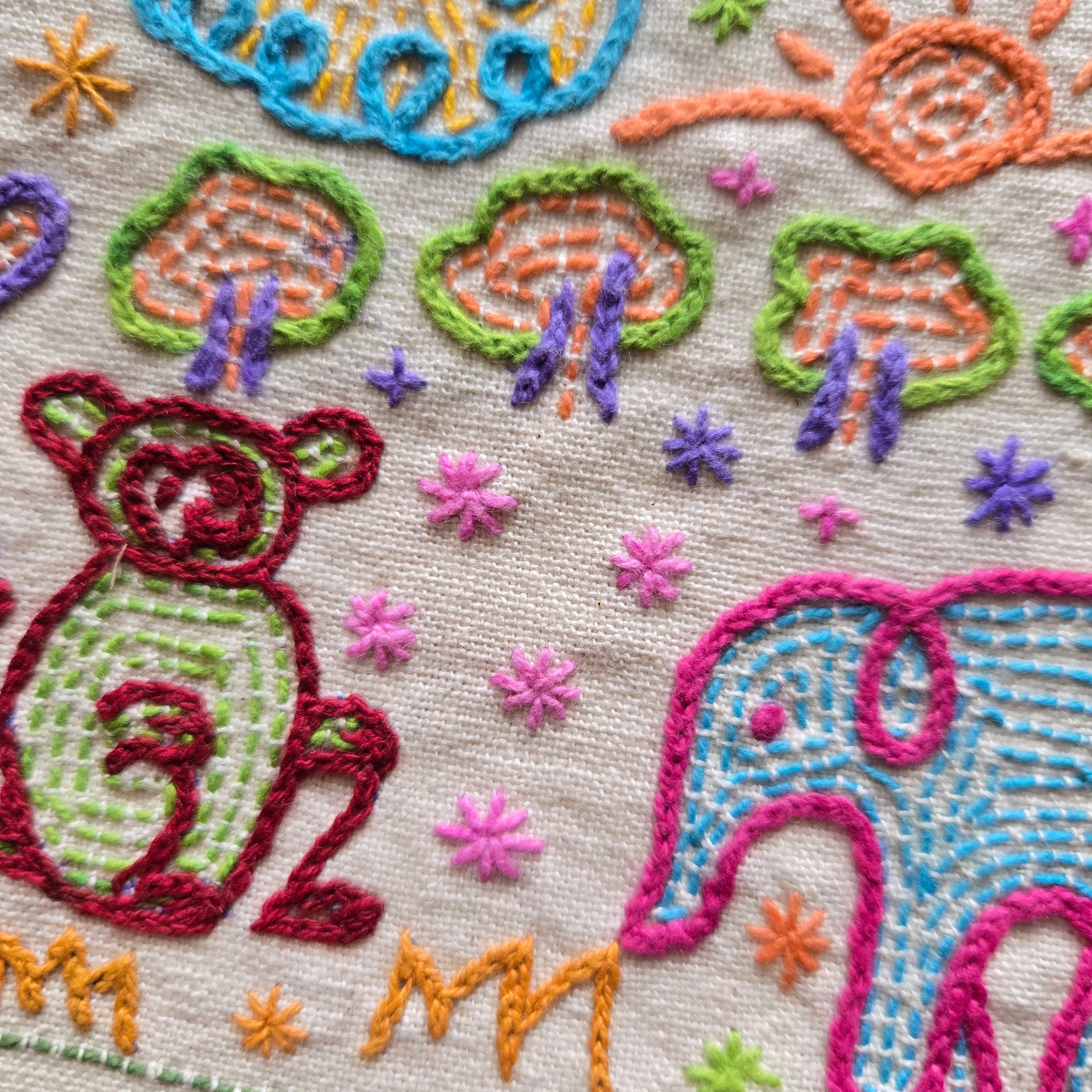 チェーンステッチを使った独特のタッチが可愛らしいハンドメイド感たっぷりの一品です。