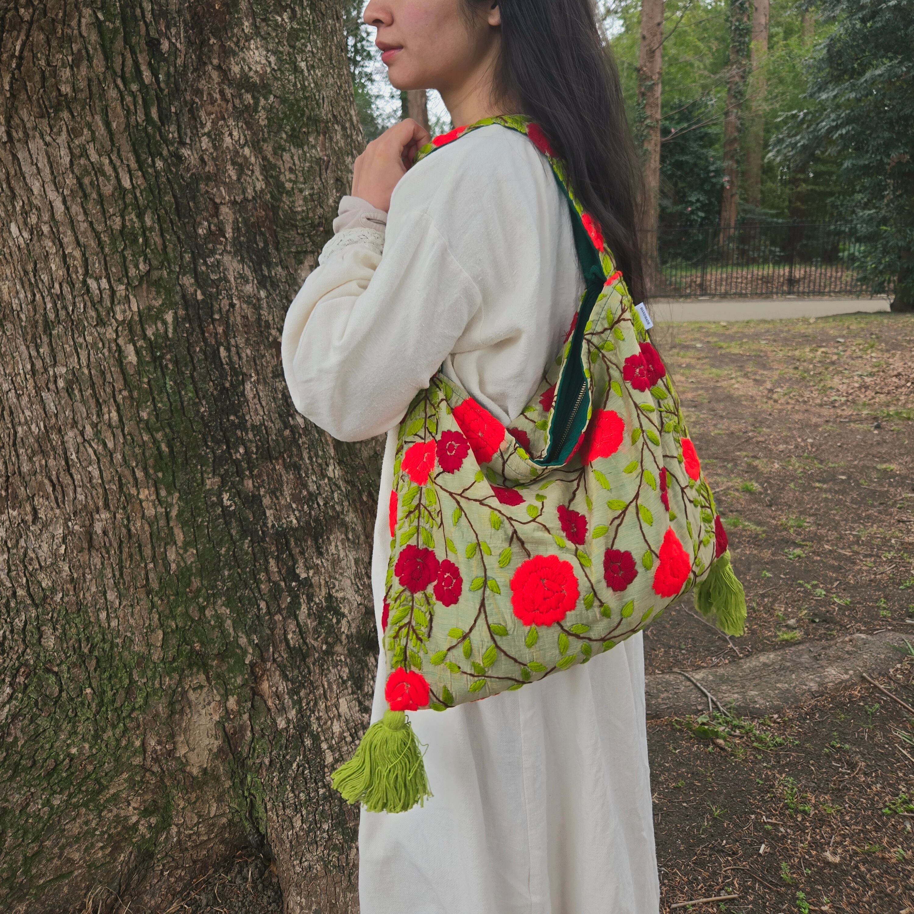 全面にあしらわれた刺繍はすべて手刺繍のため手仕事の温かみもたっぷり感じられる一品。